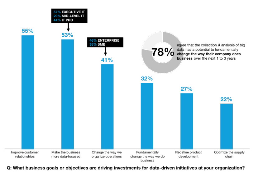 Gaining access to new information faster than competitors creates a window of opportunity to act first. In a survey by IDG, 78% of enterprises agree that data strategy and Big Data analytics have the potential to fundamentally change how their business operates within the next one to three years.